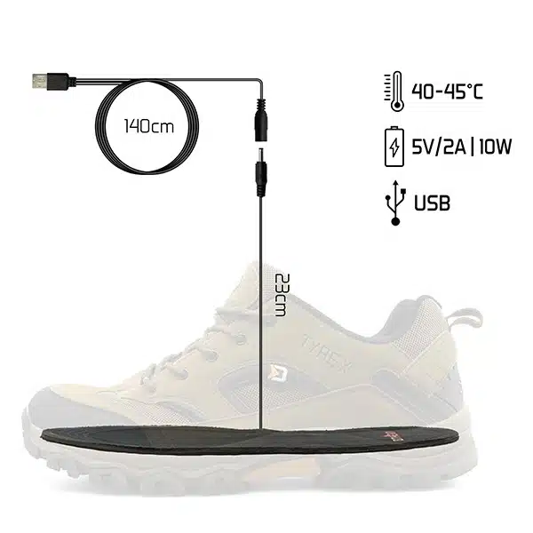 Einfach zuschneiden, in den Schuh einlegen, per USB verbinden und Wärme genießen – unkompliziert und zuverlässig. Die Anschluß-Kabel legst du durch jedes Hosenbein und verbindest die untere Steckverbindung mit der Einlegesohle. Den USB Stecker führst du aus der Hose zu einer Powerbank. Anstecken, anschließen und Wärme genießen.